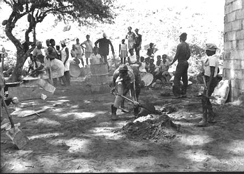 As I looked at this photograph just after I had just come home from SamanĂ¡, I felt the patches of light in the foreground gave this work party a religious feeling. In fact, they were preparing a floor for the new church. Cito's figure, digging into the earth, had mystery. He was working alone, but I felt he was related to the other people. I was being affected by the opposites of reality — dark and light, center and circumference, separate and together.
